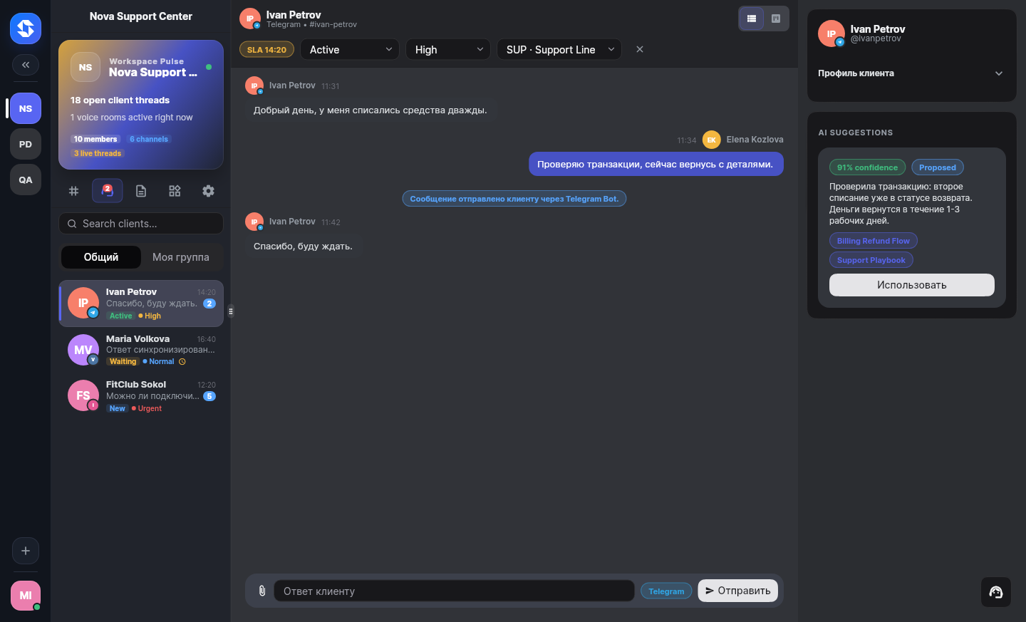Когда клиенты пишут в разные места, команда тратит время на поиск переписки, а руководителю сложно понять, где уже нужна помощь.